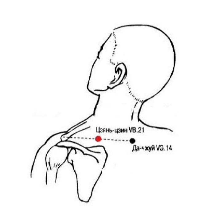 Название: «цзянь» — «надплечье»; «цзин» — «колодец». Точка Цзянь-цзин VB.21 расположена в области наднлечья, в углублении, напоминающем колодец.