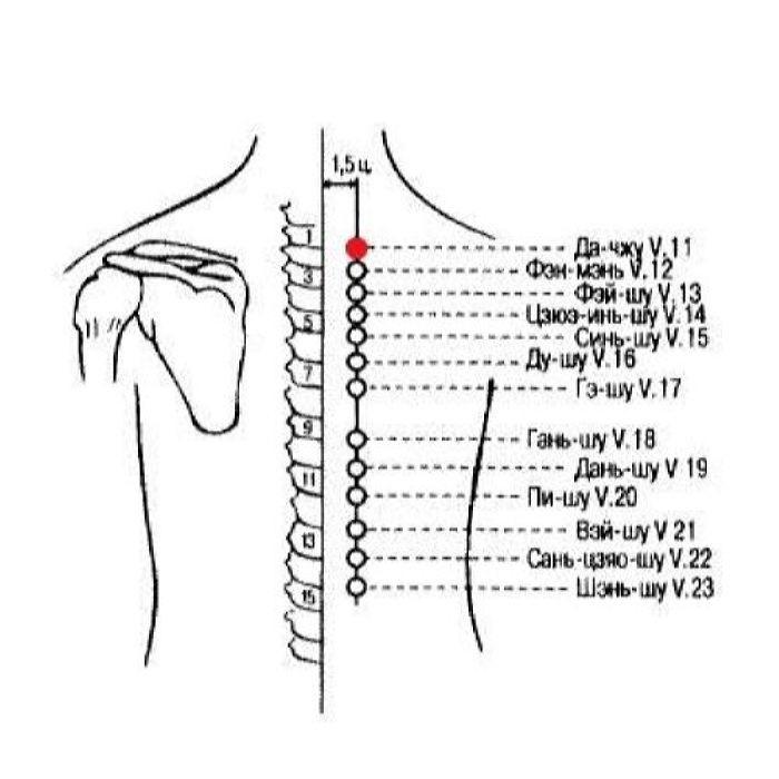 1. Да-чжу V.11 — одно из «восьми средоточий» — «средоточие костей». Точка относится к ножному тай-ян каналу мочевого пузыря, который наружно-внутренне связан с ножным шао-инь каналом почек. Почки управляют костями, к тому же эта точка расположена с двух сторон от первого грудного позвонка, в месте, на котором носят тяжести с опорой на кости, поэтому ее можно использовать при всех болезнях костей. Среди показаний к применению точки Да-чжу V.11 к этой категории болезней можно отнести боль в суставах, слабость в конечностях, невозможность долго стоять, боль в пояснице и позвоночнике, боль в области лопатки, боль в колене. Для повышения эффективности лечения иногда рекомендуется использовать сочетание точки Да-чжу V.11 со «средоточием сухожилий» Ян-лин-цюань VB.34 и «средоточием костного мозга» Сюань-чжун VB.39.