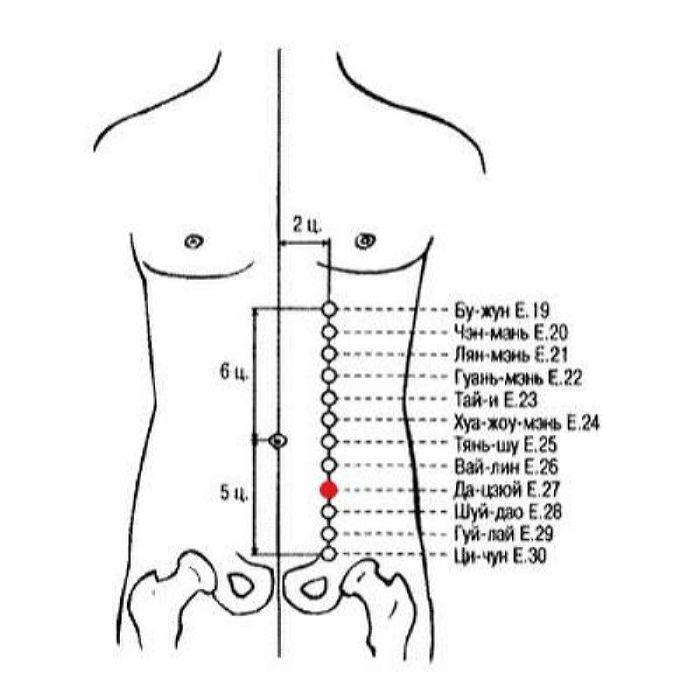 Функции: точка Да-цзюй E.27 расположена в нижней части живота, вблизи мочевого пузыря и почек, в основном используется при различных заболеваниях мочеполовой системы.