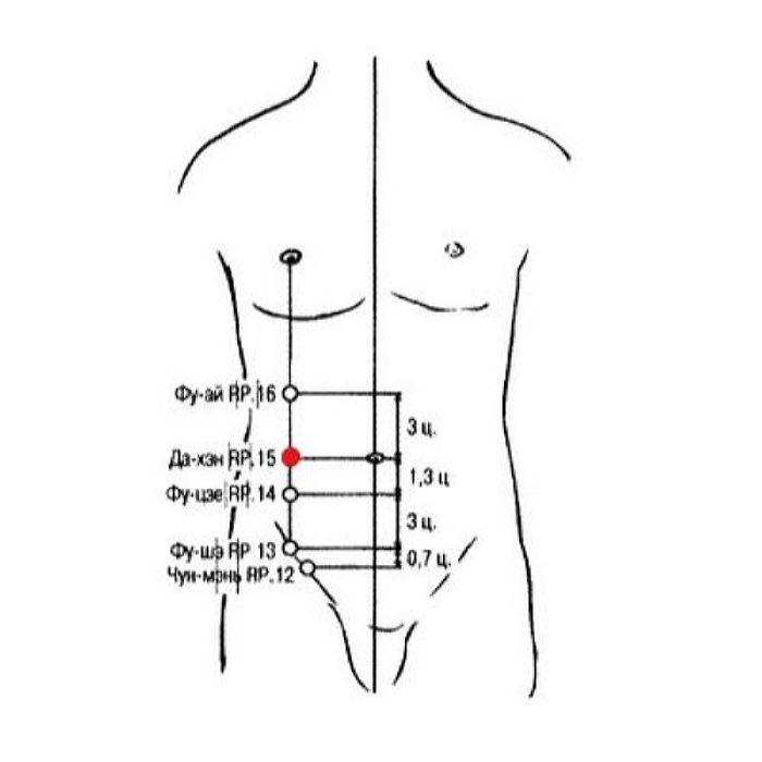 Функции: точка Да-хэн RP.15 относится к ножному тай-инь каналу селезенки, расположена на животе, обычно используется при лечении болезней, связанных со скоплением патогенного холода в Чжун-цзяо (средней части Сань-цзяо).