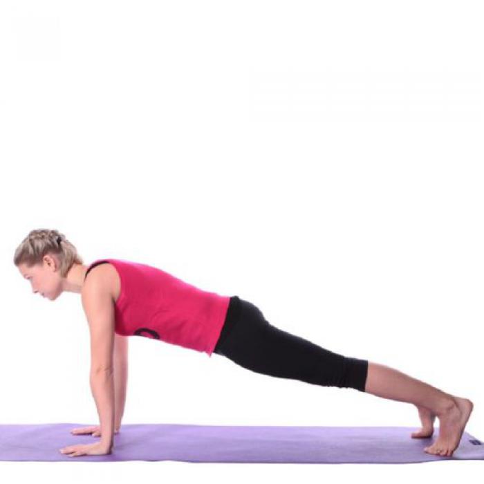 Войдите в Адхо Мукха Шванасану, затем со вдохом переместите корпус тела вперед с тем, чтобы руки оказались перпендикулярны полу, а плечи строго над запястьями. Держите корпус параллельным полу.