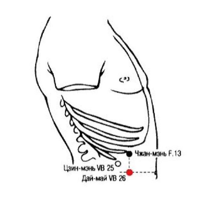 Функции: Дай-май VB.26 — точка пересечения ножного шао-ян канала желчного пузыря и сосуда Дай-май, используется при лечении болезней сосуда Дай-май - боли и слабости в пояснице, слабости и нарушении чувствительности в нижних конечностях, боли в нижней части живота у женщин, расстройств менструального цикла, белей, выпадения матки.
