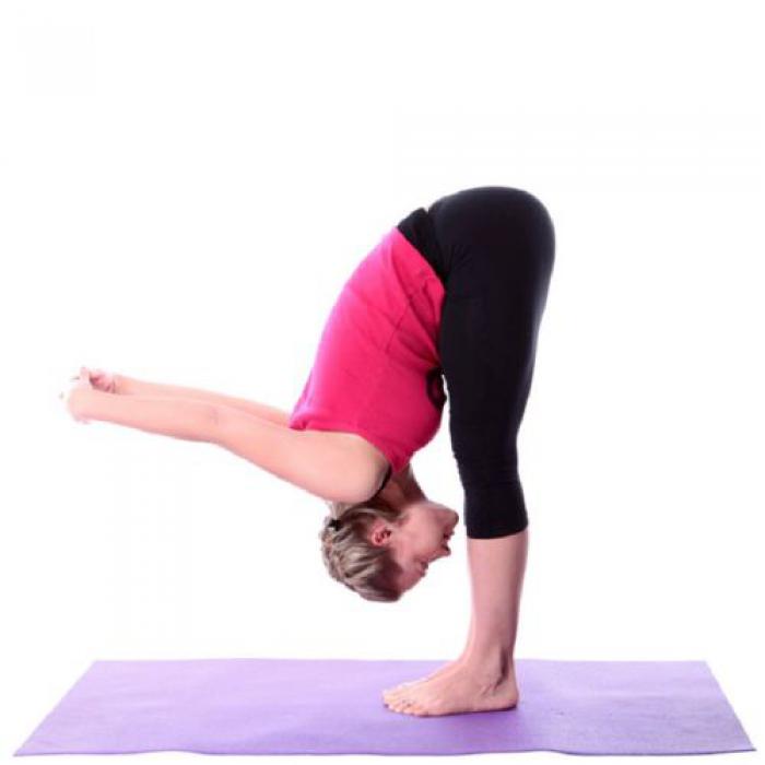 На выдохе наклонитесь вперед и вытяните руки как можно дальше за спину.