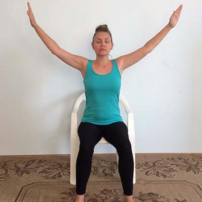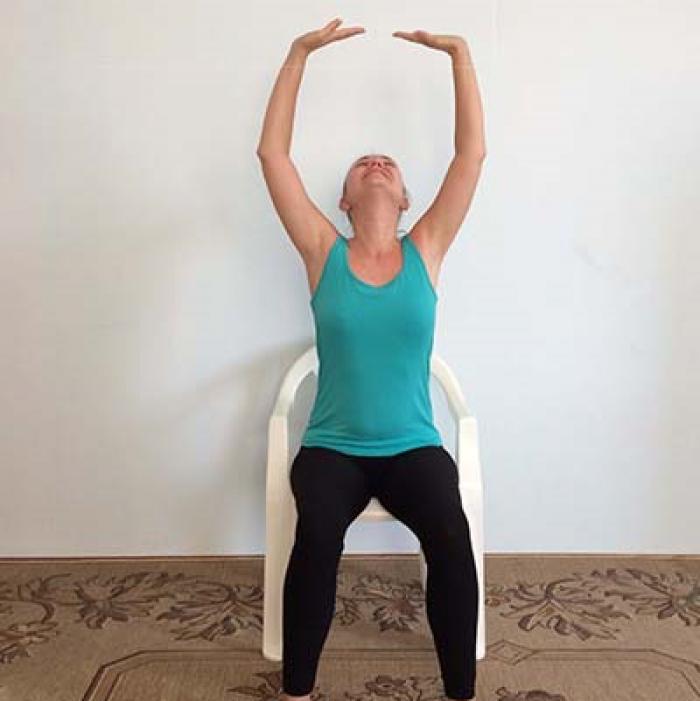 2. Сделайте глубокий вдох, откройте глаза и поднимите руки, направляя ладони к легким. Когда руки поднимутся на уровень глаз, начните разворачивать ладони пока они не окажутся у вас над головой направленными вверх. Пальцы одной руки направлены к пальцам второй. Держите локти округленными, не выпрямляйте руки.