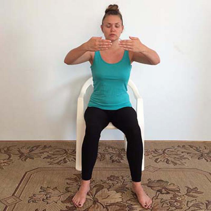 3. Когда вы полностью выдохнули, поверните ладони и соберите белый свет. Направьте этот свет от макушки в легкие. Опустите руки и держите их напротив легких, излучая яркий белый свет и мужество в легкие.