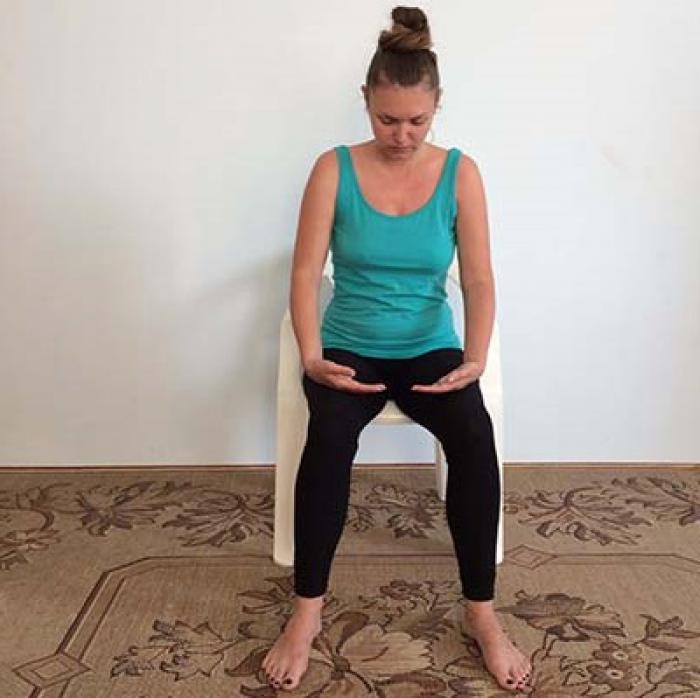3. Когда вы полностью выдохнули, сядьте вертикально, раздвиньте ноги, поднимите руки к макушке и зачерпните голубой свет. Направьте этот свет от макушки сквозь тело в почки. Опустите руки и держите ладони на почках. Излучайте голубой свет, нежность и спокойствие в почки.
