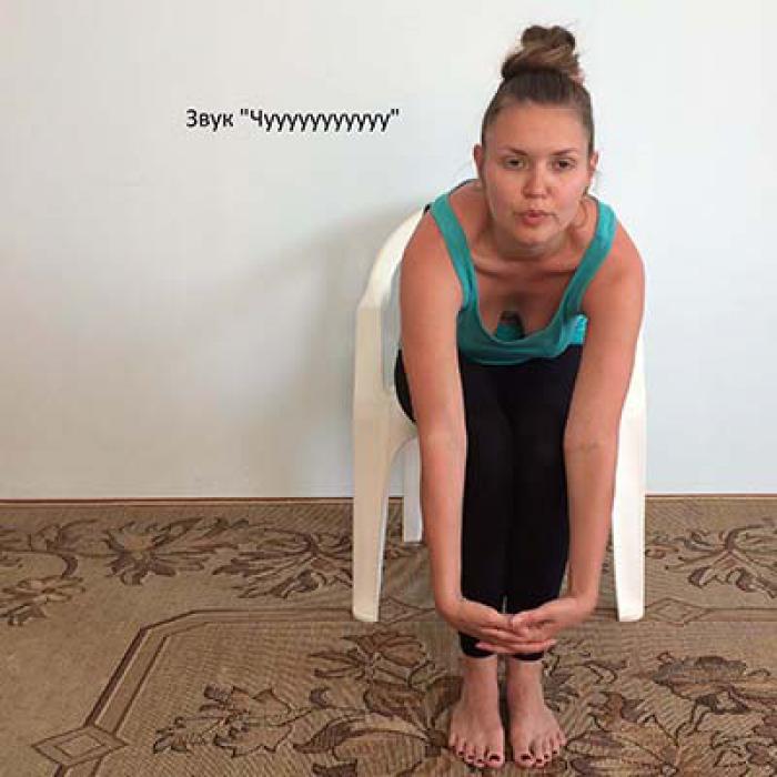 2. Сделайте глубокий вдох, откройте глаза и соедините ноги, чтобы лодыжки и колени касались друг друга. Наклонитесь вперед и обнимите руками колени. Тяните свои руки прямо от спины, сгибая торс вперед. Это позволит вашей спине прогнуться в области почек. Одновременно отклоните голову так, чтобы смотреть прямо перед собой, поддерживая натяжение рук от низа спины. Чувствуйте натяжение позвоночника. Округлите губы. Легко выдыхайте со звуком «Чуууууууу», словно вы пытаетесь задуть свечу.