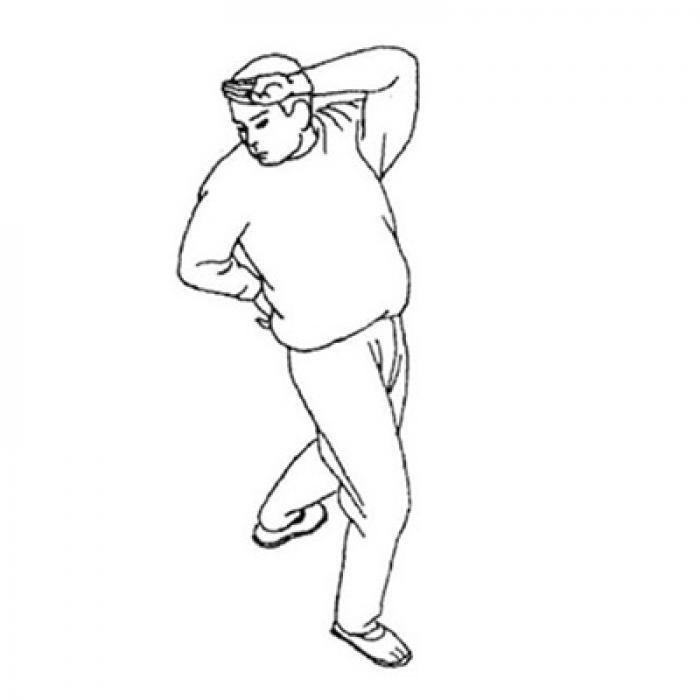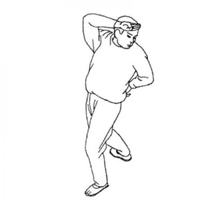 На вдохе отставьте левую ногу широким шагом влево в положение «глубокий выпад влево». Выполните поворот тела влево и положите левую кисть на пояс ладонью наружу. Правую руку поместите перед лбом на расстоянии одного кулака, развернув ладонь наружу, при этом взгляд направляется на пятку правой ноги. Пятка не отрывается от пола. На выдохе выполните выпад влево, напрягите поясницу при повороте тела влево, и представьте, что центр тяжести тела перемещается в правую пятку. Степень скручивания поясницы при выполнении поворота туловища должна увеличиваться постепенно. На этом этапе лучше всего придерживаться техники брюшного дыхания.