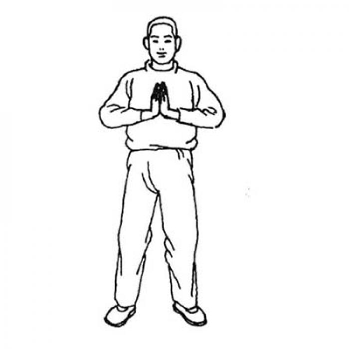 ВыбратьИсходное положение: станьте пр¤мо, расставив ступни на ширине плеч. Соедините ладони рук перед грудью, касаясь ее большими пальцами.