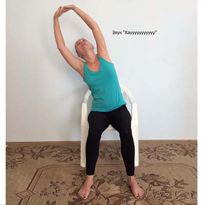 2. Сделайте глубокий вдох, откройте глаза и займите такую же позицию, как при Звуке Печени. Однако, в отличие от предыдущего упражнения, вы будете отклоняться немного вправо, чтобы произвести мягкое растяжение напротив сердца, которое находится слева от центра вашей груди.