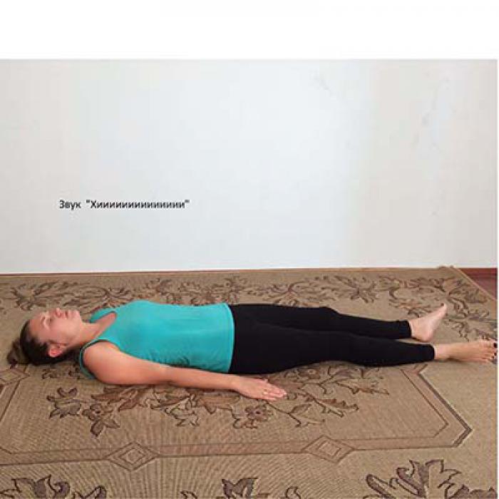 Лягте на спину или прислонитесь к спинке стула. Улыбнитесь, поднимите руки вверх и соберите Ци. Поднесите руки к своему лицу. Произнося на выдохе звук «Хииииии», позвольте рукам медленно двигаться вдоль тела вниз, перенося энергию вниз от макушки до ступней.