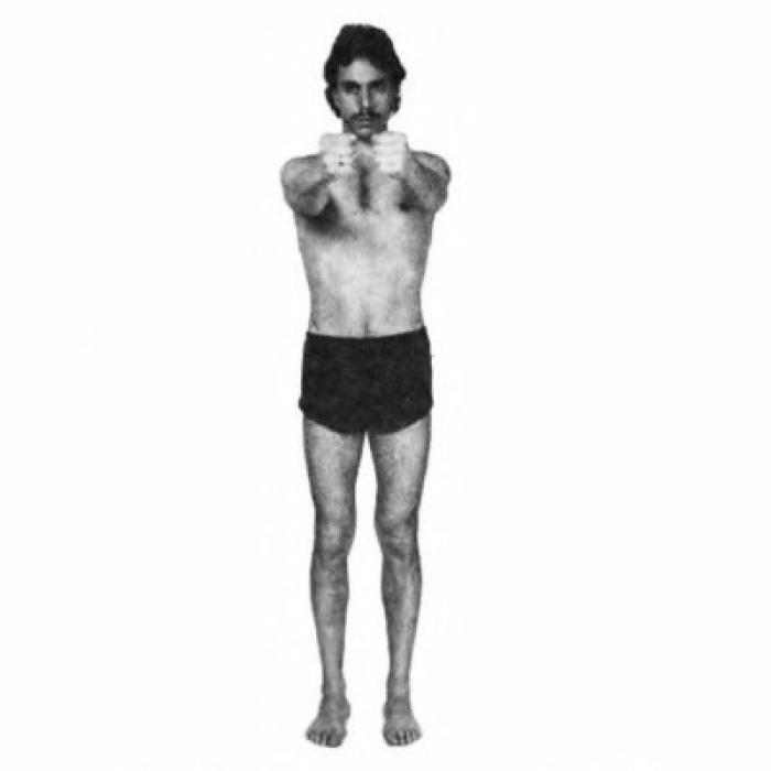 ВыбратьВстаньте прямо, ноги на ширине плеч. Сжатые в кулак руки вытяните прямо перед собой. Сделайте полный, глубокий вдох через нос и задержите дыхание. На задержке дыхания широко и резко разведите руки в стороны как можно дальше, а затем снова сведите их перед собой. Повторите три раза.