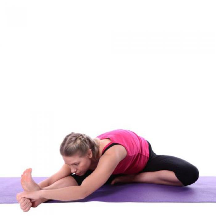 Выдохните, наклонитесь вперед и обеими руками обхватите правую стопу. Прогните спину и посмотрите вверх. Если появилась боль в пояснице, продолжать асану не нужно.