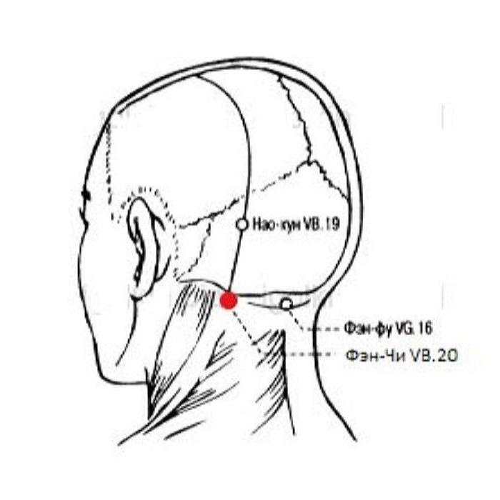 2. Фэн-чи VB.20 — точка тгересечения ножного шао-ян канала желчного пузыря и сосуда Ян-вэй-май. Сосуд Ян-вэй-май управляет наружным. В каноне «Нань цзин» (Канон трудностей) говорится: