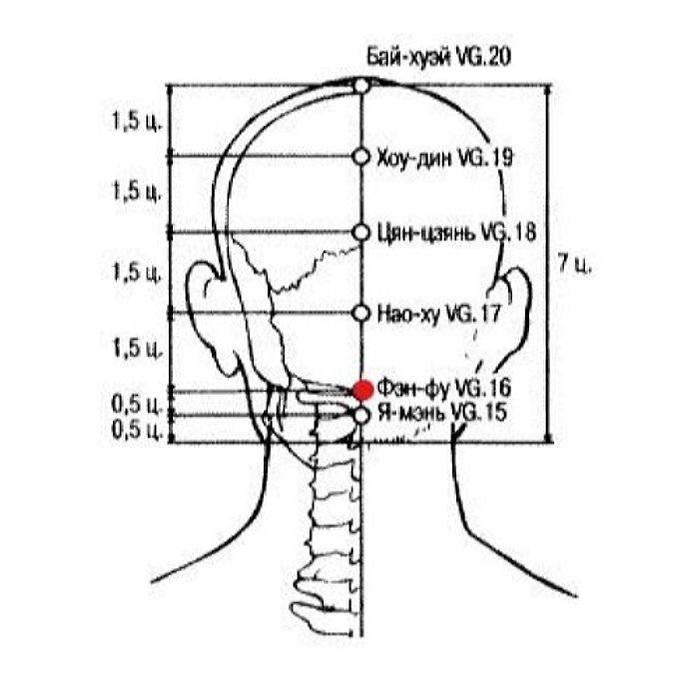 1. Фэн-фу VG.16 — одна из самых эффективных точек лечения болезней, вызванных патогенным ветром. Она расположена на затылке - в месте, через которое в организм проникает внешний патогенный ветер. Фэн-фу VG.16 — точка пересечения сосудов Ду-май и Ян-вэй-май, а также ножного тай-ян канала мочевого пузыря. Сосуд Ян-вэй-май управляет наружным. В каноне «Нань цзин» (Канон трудностей) говорится: