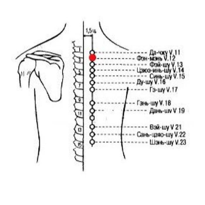Локализация: на 1,5 цуня кнаружи от места под остистым отростком II грудного позвонка.