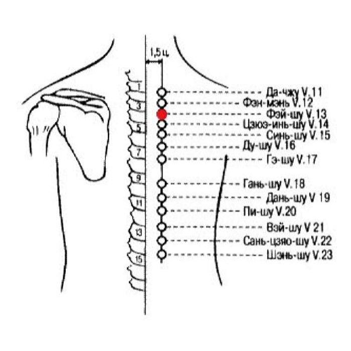 Примечание: в книгах «Лэй цзин» (Упорядоченный Канон [Желтого императора о внутреннем], 1624 г.) и «И цзун цзинь цзянь» (Золотое зеркало медицины, 1749 г.) говорится, что точка Фэй-шу V.13 расположена на 2 цуня кнаружи от задней срединной линии.
