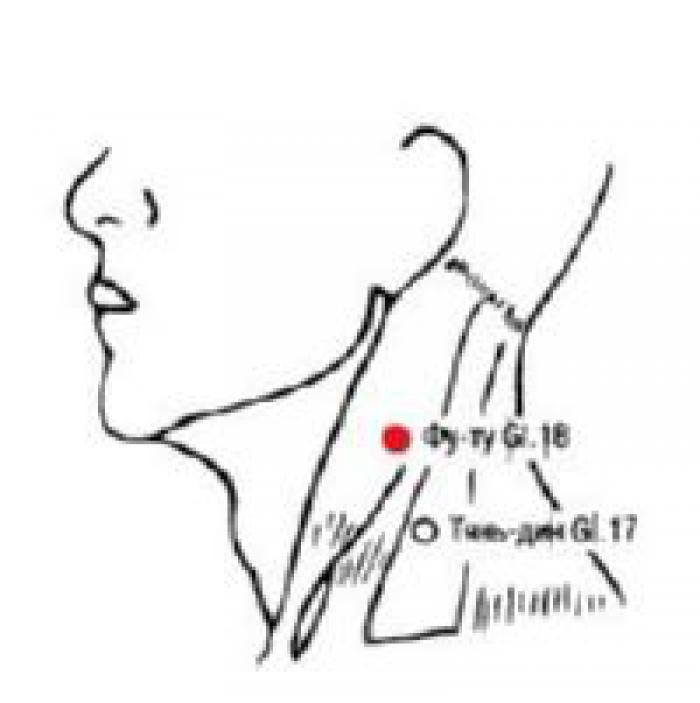 2. Точка Фу-ту GI.18 расположена на шее, поэтому основными показаниями для использования точки являются различные заболевания горла. Кроме того, Фу-ту GI.18 относится к ручному ян-мин каналу толстого кишечника, который имеет наружно-внутреннюю взаимосвязь с ручным тай-инь каналом легких, а легкие тесно связаны с горлом.
