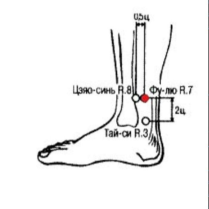 2. Точка Фу-лю R.7 относится к ножному шао-инь каналу почек. Почки управляют жидкостями, являются главным органом водного обмена. При нарушении функциональной активности Ци почек нарушается «открывание» и «закрывание» почек, что может привести к дисбалансу водного обмена, возникают водянка и отеки, при лечении которых можно использовать точку Фу-лю R.7.