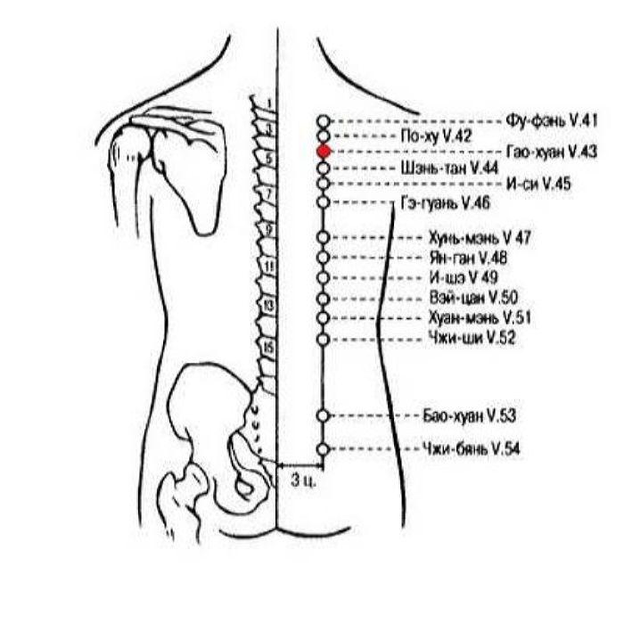 Примечание: в книгах «Лэй цзин»(Упорядоченный Канон [Желтого императора о внутреннем], 1624 г.) и «И цзун цзинь цзянь» (Золотое зеркало медицины, 1749 г.) говорится, что точка Гао-хуан V.43 расположена на 3,5 цуня кнаружи от задней срединной линии.