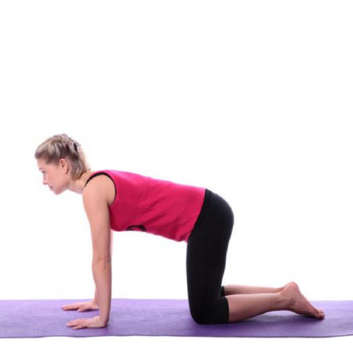 Наклониться вперед и поставить руки перед собой на 40-50 см. от колен.
