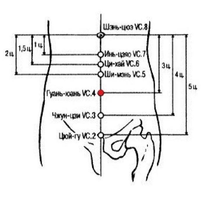 3. Гуань-юань VC.4 — му-точка живота тонкого кишечника. Основной функцией тонкого кишечника являются отделение «чистого» от «мутного». В книге «И сюэ жу мэнь» (Вводный курс медицины, 1575 г.) говорится: