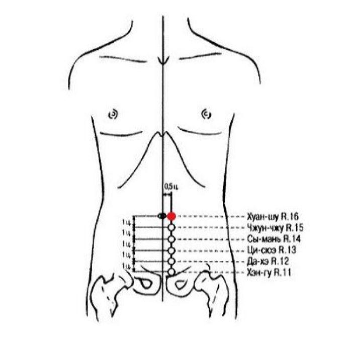 • Ощущение распирания в эпигастральной области: Хуан-шу R.16, Ци-мэнь F.14, Чжун-вань VC.12.