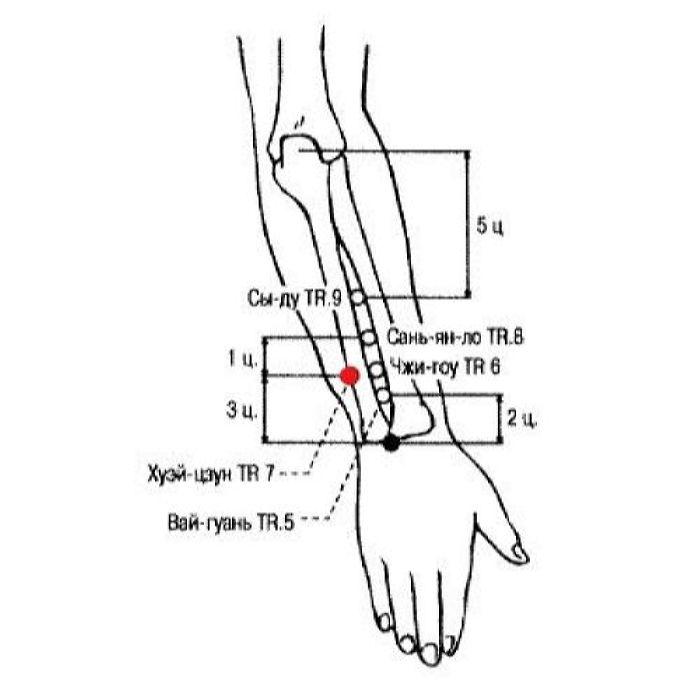 Локализация: на 3 цуня выше тыльной лучезапястной складки, у лучевого края локтевой кости, приблизительно на 0,5 цуня к локтевой стороне от точки Чжи-гоу TR.6.