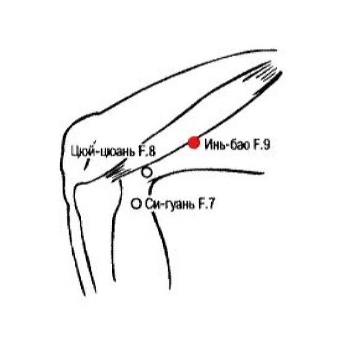 Функции: Инь-бао F.9 относится к ножному цзюэ-инь каналу печени, который проходит через половые органы. Основной функцией точки является нормализация менструального цикла. Чаще всего она используется при дисменорее, а также при затрудненном мочеиспускании и ночном недержании мочи. В книге «Чжэнь цзю да чэн» (Великие достижения иглоукалывания и прижигания, 1601 г.) кроме указанных болезней точку рекомендуется использовать при боли в пояснице и крестце с иррадиацией в паховую область.