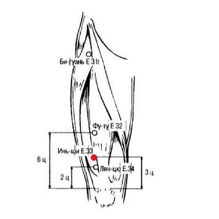 1. Название точки Инь-ши Е.33 тесно связано с ее функциями. Использование точки способствует устранению синдромов типа Инь, возникающих в результате недостатка Ци или скопления патогенного холода. Ножной ян-мин канал желудка, к которому относится точка Инь-ши Е.ЗЗ, имеет наружно-внутреннюю взаимосвязь с ножным тай-инь каналом селезенки. При нарушении функций селезенки и желудка могут возникнуть различные заболевания со свойствами недостатка Ян-Ци. Ослабление Ци селезенки может привести к нарушению водного обмена, скоплению сырости и образованию внутреннего Инь-холода. Кроме того, первичная Ци, источник которой находится в почках, также требует постоянного пополнения со стороны приобретенной Ци, что обеспечивается при помощи функциональной активности селезенки и желудка. Другими словами, при ослаблении функций селезенки и желудка может возникнуть недостаток Ян почек, ослабевает прогревающая функция почек. Таким образом, основными функциями точки Инь-ши R33 являются восполнение Ци селезенки и желудка, рассеивание холода и прогревание почек.