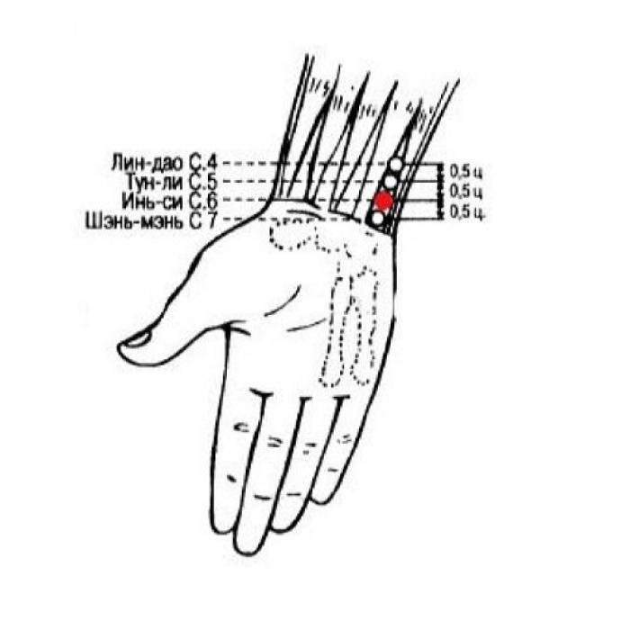 Локализация: на лучевой стороне сухожилия локтевого сгибателя кисти, на 0,5 цуня выше проксимальной лучезапястной складки.
