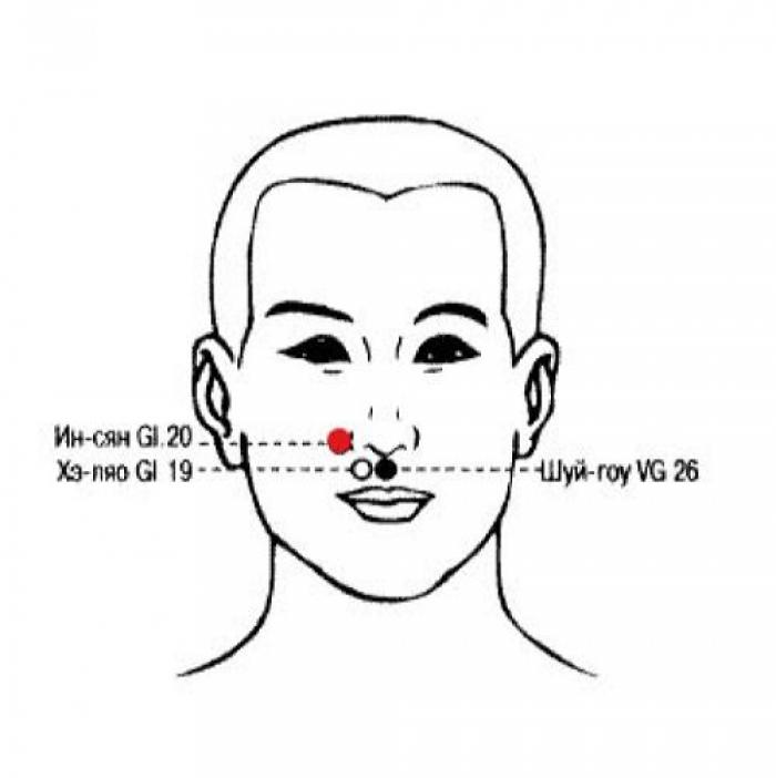 Функции: точка Ин-сян GI.20 расположена в области носа, поэтому основными показаниями для ее использования являются различные заболевания носа, а также некоторые болезни лица.