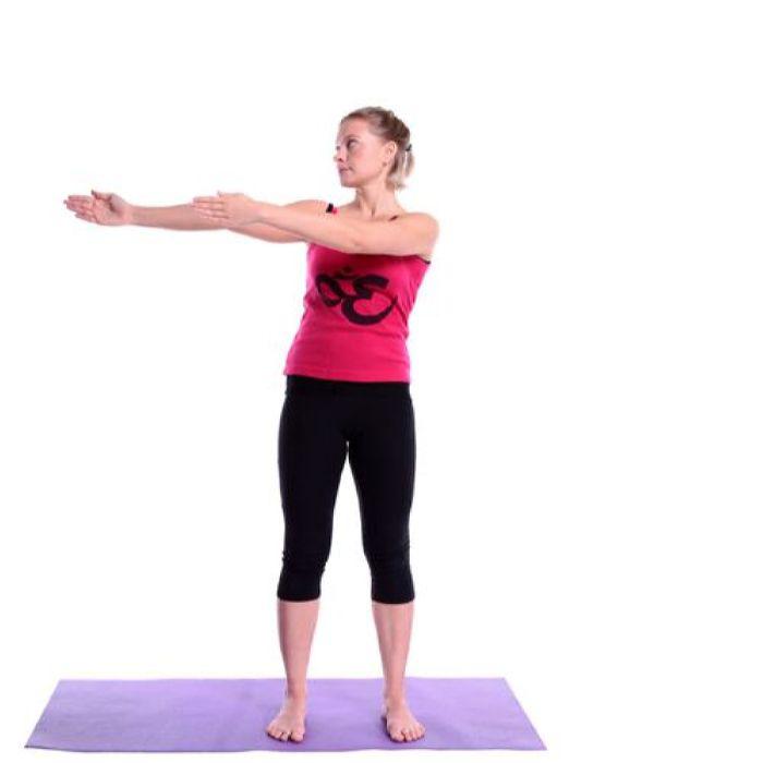 На вдохе возвращаемся - руки перед собой.