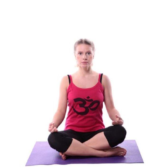 Спина прямая, руки находятся на коленях, пальцы в гьян или чин мудре. Закройте глаза и расслабьте всё тело.