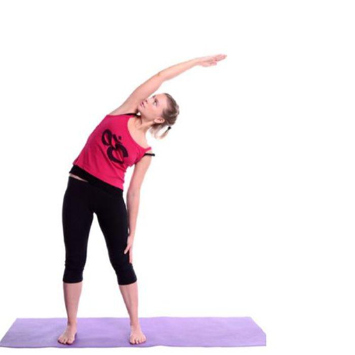 Затем сделайте полный вдох, вытягивая туловище и руку и вернитесь в вертикальное положение. При выдохе опустите руку вниз в исходное положение. Повторите асану в правую сторону.