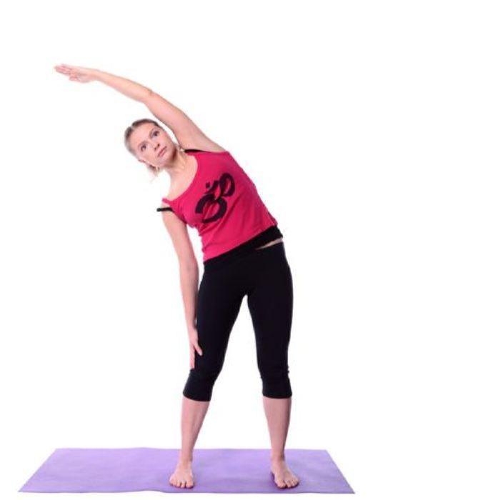 Затем сделайте полный вдох, вытягивая туловище и руку и вернитесь в вертикальное положение. При выдохе опустите руку вниз в исходное положение. Повторите асану в правую сторону.