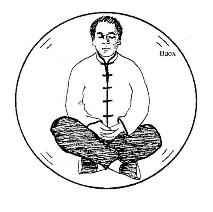 3. Сделать такой же медленный спокойный выдох. Так же не акцентируйте свое внимание на качестве выдыхаемой ци. Почувствуйте, как этот выдох снова проходит через всю поверхность тела, но уже наружу.