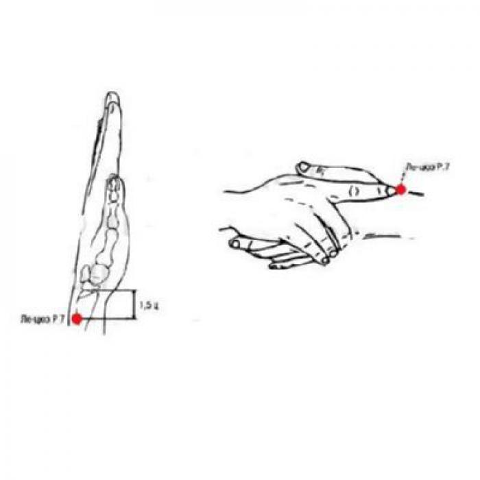 2. Точка Ле-цюэ Р.7 относится к ручному тай-инь каналу легких, способствует нормализации Ци легких, может использоваться при лечении основных болезней легких — кашля, одышки и т. д.