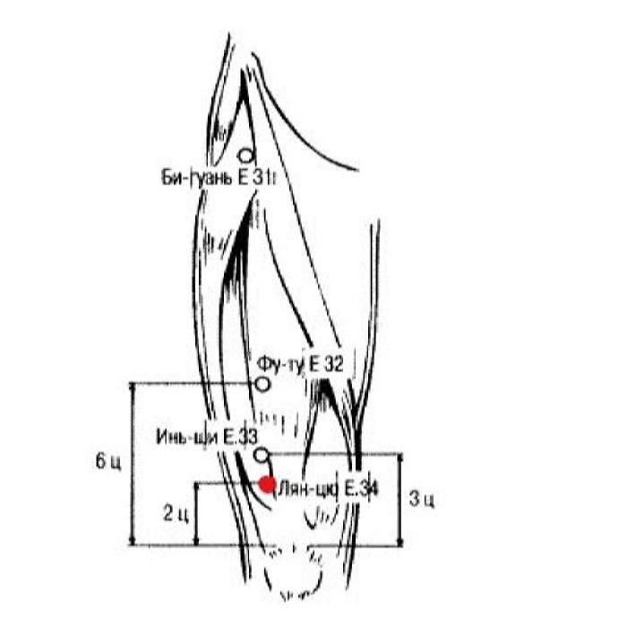 1. Лян-цю Е.34 является точкой ножного ян-мин канала желудка, может использоваться при лечении некоторых болезней желудка. Кроме того, Лян-цю Е.34 — точка-щель этого канала, а патологические изменения в определенном цзанфу-органе часто отражаются на точке-щели соответствующего канала, поэтому их пальпация имеет определенное значение в диагностике.