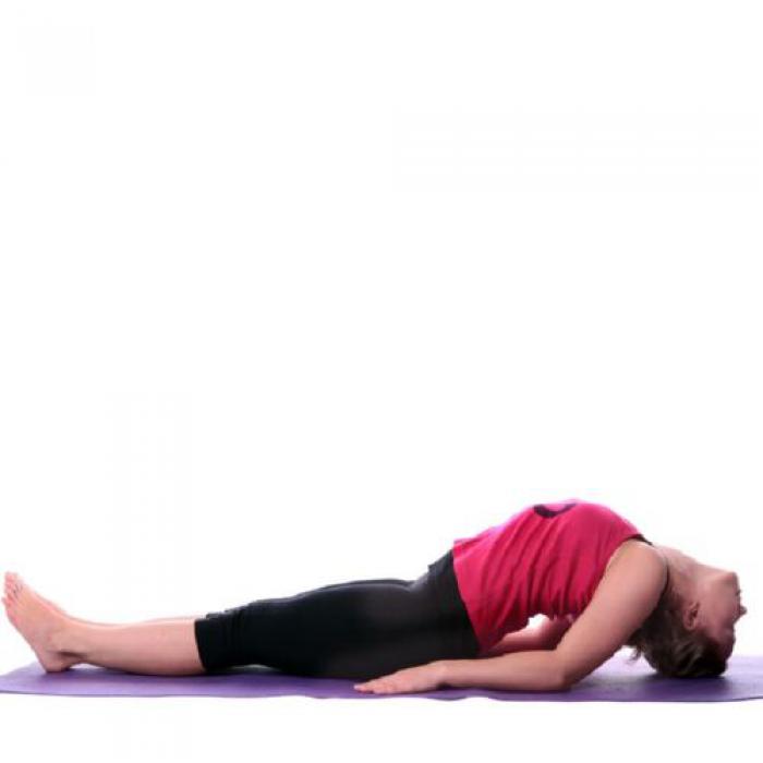 Выдохните, выгните спину, подняв шею и грудь, голову откиньте назад и опустите темя на пол.