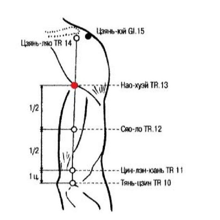 Нао-хуэй TR.13 — точка ручного шао-ян канала Сань-цзяо, локальная точка лечения боли в области плечевого сустава и плеча.