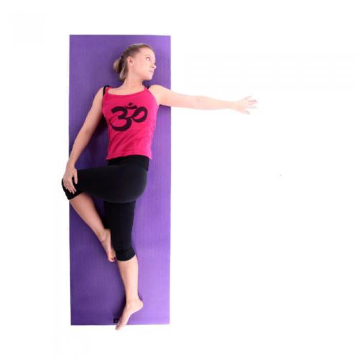 Не отрывая плеч, рук и правой ноги от пола повернитесь на правый бок.