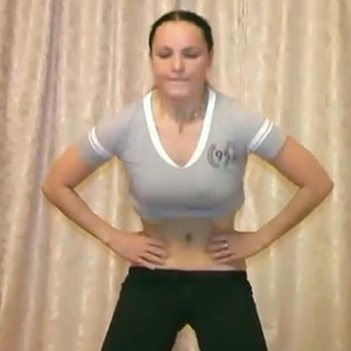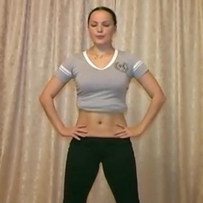 1. Встаем на коврик, ступни широко расставлены (45-100 см друг от друга). Чуть сгибаем ноги в коленях и стоим в полуприседе, упираясь руками на ноги чуть выше коленей (большими пальцами внутрь). Голову не опускаем, глаза открыты (можно смотреть на живот, подняв футболку и прижав ее подбородком). Выдох.