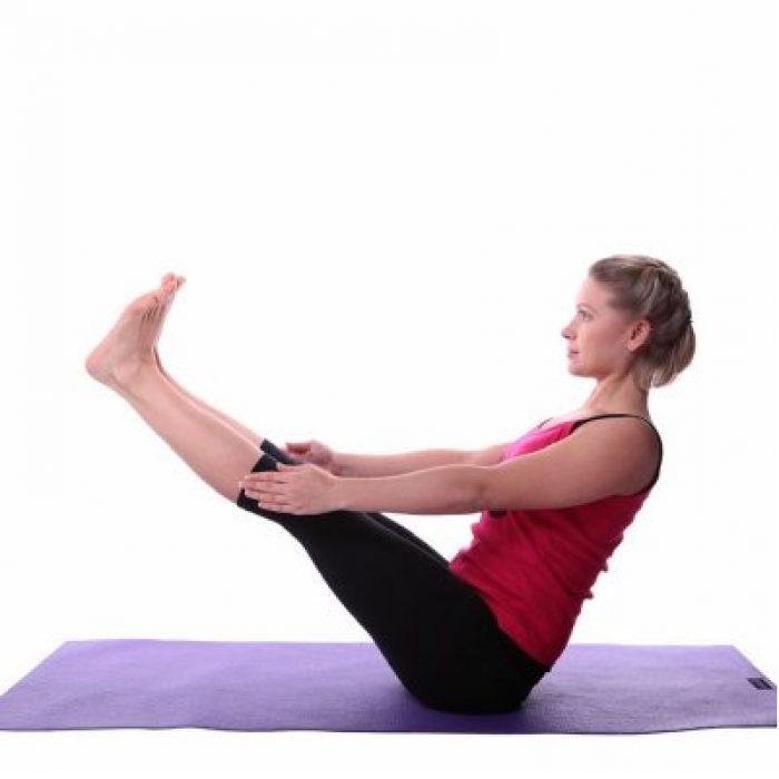 Держите обе ноги прямыми (колени и бедра подтянуты вверх) и балансируйте на ягодичных костях. Поднимите ноги так, чтобы они составили с полом угол 60 градусов и оказались выше головы.