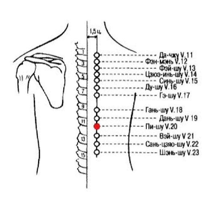 Примечание: в книгах «Лэй цзин» (Упорядоченный Канон [Желтого императора о внутреннем], 1624 г.) и «И цзуи цзинь цзянь» (Золотое зеркало медицины, 1749 г.) говорится, что точка Пи-шу V.20 расположена на 2 цуня кнаружи от задней срединной линии.