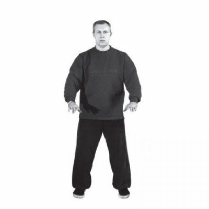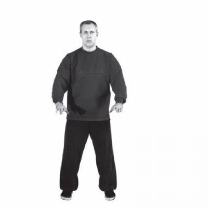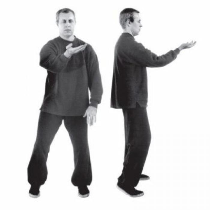 Кисть формируется так, словно вы держите тяжелый шар диаметром около 30 см. Траектория направлена по диагонали, как бы к разноименному плечу, где и находится ее верхняя точка. Достигнув вершины, рука подтягивается к центру груди, одновременно разворачиваясь ладонью вниз, и с выдохом опускается вдоль живота, будто вы загружаете в даньтянь то, что лежит на ладони. Пятка при этом снова опускается на пол, а все тело словно «стекает» вниз, как растаявший снеговик. Не задерживаясь в центральной переходной фазе, повторяем форму другой рукой.