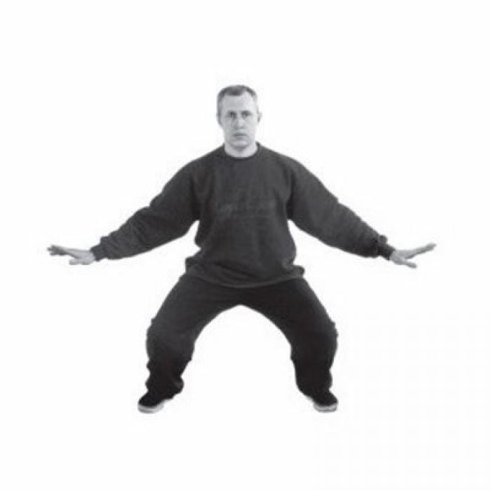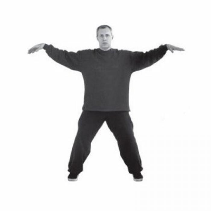 Для перехода к этому упражнению нет необходимости менять стойку. Оставаясь в «ма-бу», в последний раз с выдохом возвращаем кулак на пояс и сразу даем рукам возможность слегка опуститься вдоль бедер, тотчас на вдохе плавно подняв их через стороны до уровня плеч.