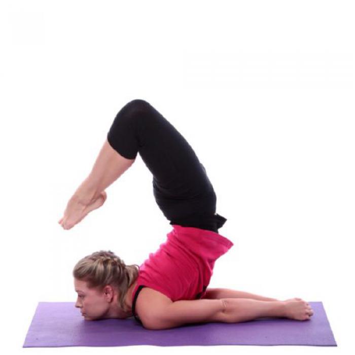 Балансируйте на плечах, подбородке и руках. Попытайтесь коснуться головы пальцами ног.