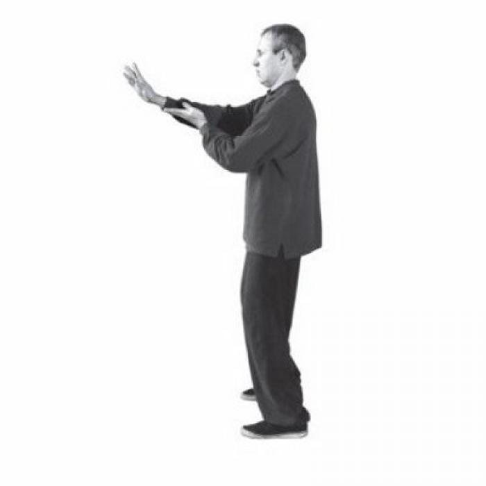 Упражнение имеет глубокие корни в боевой традиции ушу, обладая широким спектром применения. С одной стороны, оно формирует навык притягивания противника навстречу бьющей ладони, с другой – учит активизировать энергию поясницы, используя ее для повышения мощи удара. Скручивая бедра и корпус с одновременным скольжением руки, мы стимулируем циркуляцию энергии в поясничном меридиане дай-май, захватывая при этом почки. Если же Ци канала дай-май и почек возбуждены, то правильная координация раскручивания поясницы с ударным движением порождает могучий «сброс» через атакующую руку (еще более ярко этот механизм проявляется в 9 и 14-й формах). Скольжение мизинца (канал тонкого кишечника) по внутренней стороне предплечья (канал перикарда) создает замкнутый контур, давая возможность энергии накапливаться и «уплотняться». Сведение локтей и плеч внутрь и сохранение пустоты в подмышечных впадинах освобождает плечевой пояс от напряжений (в том числе неосознанных) и убирает препятствия на путях следования Ци.