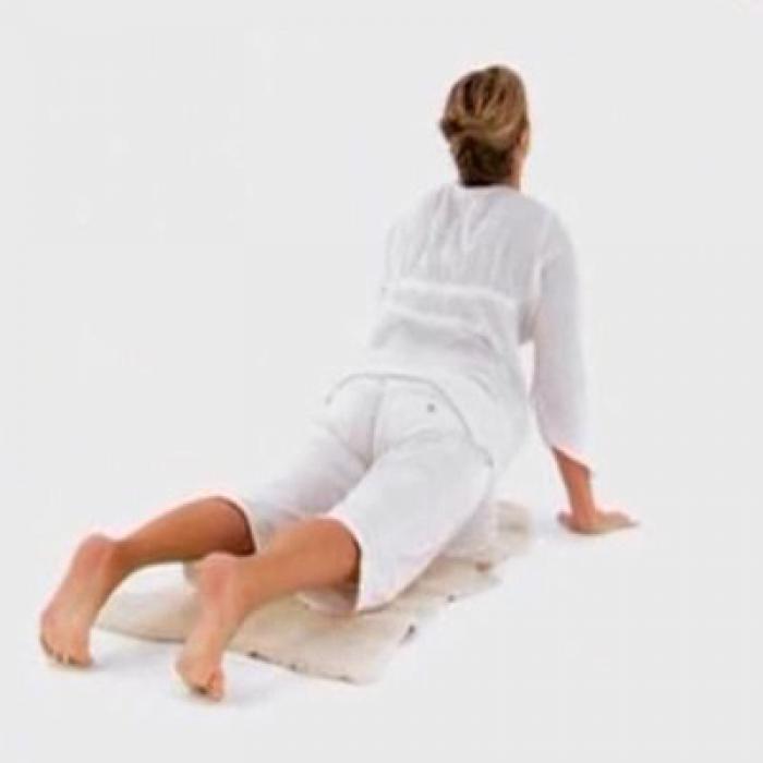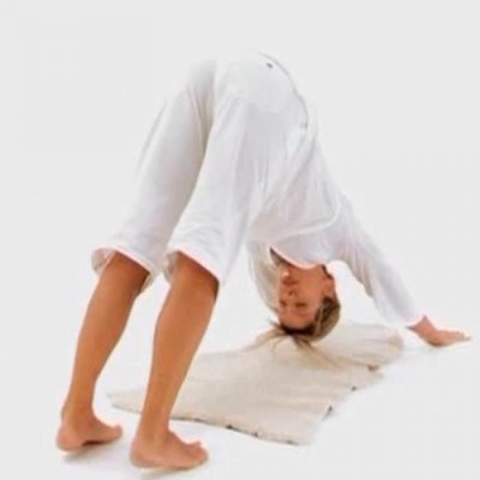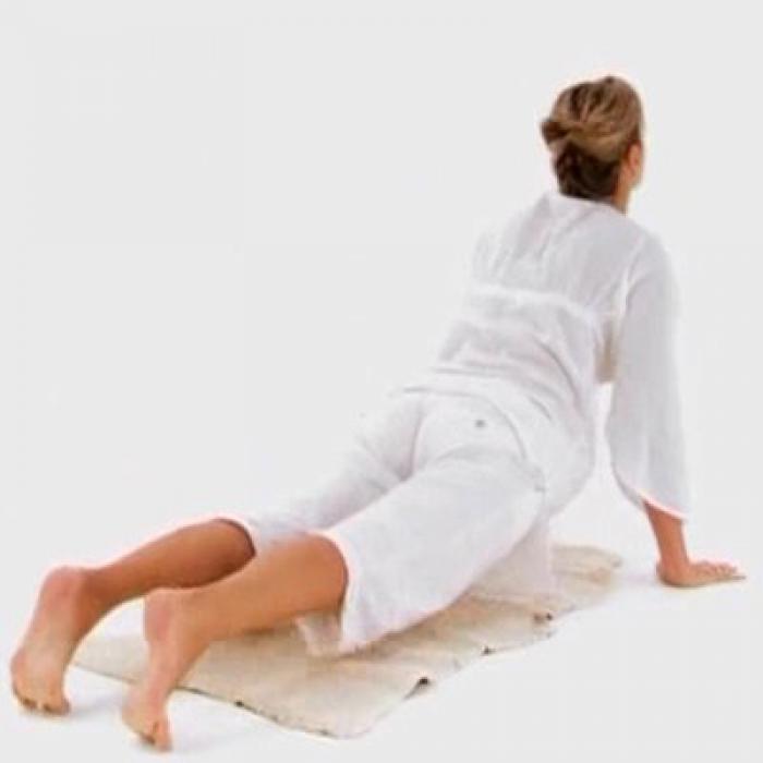 Не сгибая рук и ног, на вдохе поднимите бедра и ягодицы вверх так, чтобы туловище образовало правильный треугольник. В этой позиции подбородок должен касаться груди.